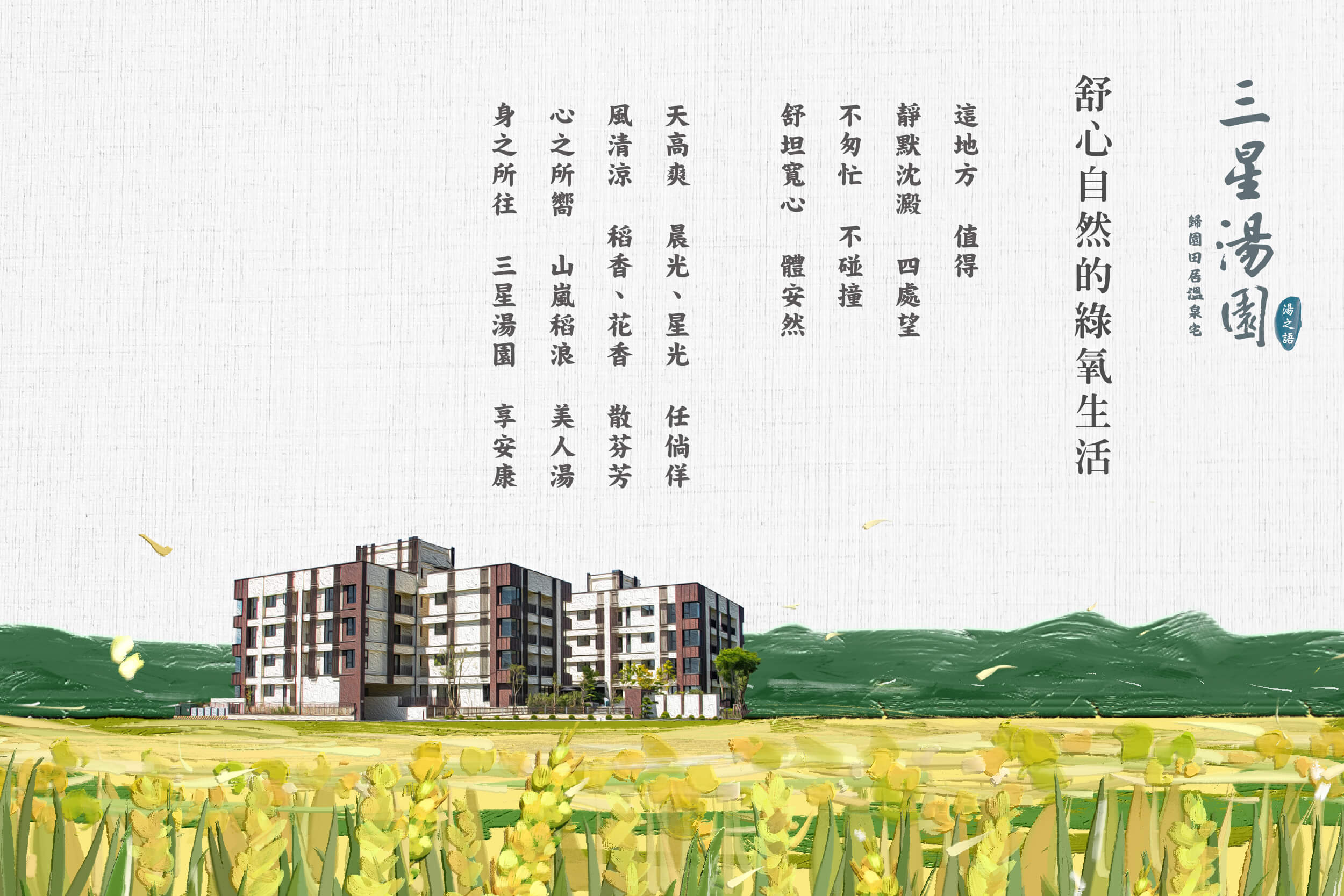 湯之語建設在建築開發上,自始秉持尊重自然、保持原貎、和諧開發、善待與愛護地球的理念,盡心為每一塊土地和週遭的人們創造最大的價值,搭起建造在這片土地上的建築與居住者之間相惜相守的一世情感。